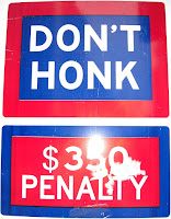 "350 $ penalty" fürs Hupen? Statt "Don't honk" könnten sie in New York genau so sinnvoll anschreiben: "Nicht atmen", "Biete keinen Touristen an, ihnen den Weg zu zeigen, nur weil sie kurz stehenbleiben, um sich die Architektur anzuschauen" oder "Überquere nicht die rote Ampel, wenn ein Autofahrer nicht den Maximalabstand von 1 m zum vorherigen Fahrzeug einhält, Du beim Essen auf dem Blackberry tippst und dabei telefonierst".