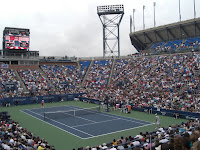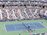 Dann geht es zum Halbfinale der US Open mit der Nr. 1, 2, 3 und 6 der Welt. Zuerst gewinnt Federer gegen Djokovic in vier Sätzen. Obwohl schon dieses Spiel wegen Hanna vorverlegt wurde, kommt auf einmal nach 2 Sätzen die Durchsage, dass Nadal gegen Murray parallel im kleineren Louis Armstrong Stadion stattfindet! D.h., Halbfinalbesucher konnten sich praktisch nur ein Spiel ansehen... Auf der Anzeigentafel haben sie nur ab und zu alte Ballwechsel des Nadal-Spiels gezeigt, dafür aber immerhin Werbung für einen Handy-Service, mit dem man den Live-Score abrufen kann.