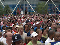 Kurz vor dem Ende bricht in Arthur Ashe dann auch tatsächlich eine Stampede los. 24000 Zuschauer rennen los für nicht einmal die Hälfte der Plätze im anderen Stadion. Ein Studienkollege und ich mittendrin. Asafa Powell kann abdanken. Wir standen dann am Kopf einer Riesenschlange von mehreren Tausend Menschen und plötzlich fangen hinter uns Sprechchöre an, die immer lauter werden. Alle schreien wie verrückt, die Sicherheitskräfte schaffen es zumindest, die Kinder heraus zu ziehen aus dem Gedränge. Ein Mann, der behauptet, der Cousin von Nadal zu sein,