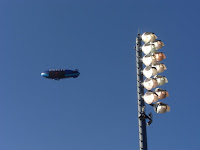 und ein Zeppelin über uns, der auf der Längsseite aus einer dynamischen Anzeigenfläche besteht. Eine Art fliegender Fernseher, der unentwegt wie ein fliegender Holländer über Benedikt und mir kreuzte.