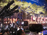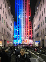 Mit F., der Französin aus London (1), bin ich dann zum Rockefeller Center gefahren. Dort haben wir uns mit S., meiner neuen pakistanischen Nachbarin aus London, N., einer unserer Brasilianierinnen, und P., dem Inder, getroffen. NBC hat hier mehrere Studios auf der Election Plaza aufgebaut (2). Die für Weihnachten berühmte Eislaufbahn wurde in eine Amerika-Karte umgewandelt, auf der sich nach und nach erstaunlich viele Staaten blau färbten (3). 30 Rock, das Zentrum des Rockefeller Centers (Saturday Night Live, Top of the Rock, NBC Hauptsitz, ...), wurde jeweils zur Hälfte in blau und rot angestrahlt. Es gibt keine bessere Bühne.