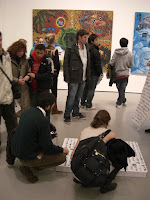 MoMA: Highlight aber war das MoMA, das seine Türen dank Target von 4 bis 8 pm kostenlos öffnet zu einer der bedeutendsten Sammlungen zeitgenössischer Kunst. D.h., nicht ganz kostenlos: Es geht auf Kosten des Schlangestehens, bis zu einer Stunde lang. Wir waren gerade mittendrin, als ich mich geärgert habe, nicht Lotto gespielt zu haben. Ein Pärchen kommt zielgerichtet auf uns zu und drückt uns zwei Staff Guest Tickets in die verdutzten Hände. Mit diesen VIP-Tickets konnten wir ohne weiteres Anstehen direkt hinein. Das Beste: Es gab eigentlich keine weiteren Tickets für Van Gogh and the Colors of the Night, eine Sonderausstellung, die Anfang Januar aufhört. Es bildete sich innen drin nochmals eine Schlange für Stand-By-Tickets. Wir konnten dann mit unseren Tickets einfach durchmarschieren, was wir vor lauter Spaß (und weil ich meinen eigenen, privaten Audioguide beim ersten Mal nicht aktiviert bekam) gleich zwei Mal taten. Neben einem Hippy-Happening gab es eine zweite hochkarätige (von mehreren) Sonderausstellung, Joan Miró: Painting and Anti-Painting 1927–1937. Davon habe ich aber nur den Eingang... der Rest ist aus der Dauerausstellung.