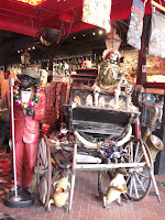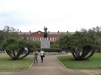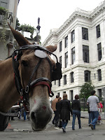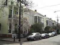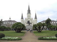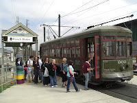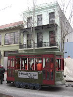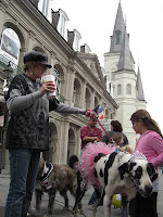 Wie man hier vorankommt? Meist zu Fuß auf allen vieren oder zweien, manchmal zu Pferde und zumindest einmal sollte man den historischen Zug ausprobieren, der noch auf mehreren Strecken fährt und älter als der von San Franzisco ist! Links unten fahren wir gerade vom French Market ab, rechts unten ist die Mardi Gras Version mit Big (Small?) Band zu sehen. Hinter dem Pferd ist das höchste Gericht von Louisiana zu sehen. Unter dem Hund sind seine pinken Pfotennägel nicht zu sehen, die gibt es nur in Mascha's Blog! Ich weigere mich!