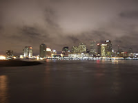 Es geht aber auch anders. Abends habe ich mein Geschenk eingelöst: Eine Fahrt mit dem Steamboat Natchez inkl. Dinner-Buffet und Live-Jazz mit den Dukes of Dixieland! Im gespenstischen Nebel ging es los (Bild rechts bei morgendlich guter Sicht...), mit dem guten Essen und beschwingter Big-Band stellte sich dann die gute Sicht ein!
