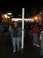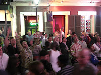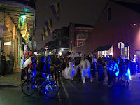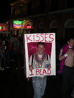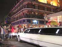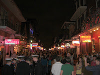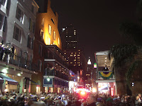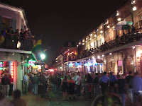 Direkt nach den Paraden in ganz New Orleans strömen alle - und ich meine alle - in eine einzige Straße, die Bourbon St. Die macht ihrem Namen auch alle Ehre. Zu den üblichen Traumfassaden kommt Live-Bands, die halb auf der Straße stehen, Leute, die kaum auf der Straße gehen können, und Kettenwerfer, die auf dem Balkon stehen. Die Straße ist in jeder Hinsicht unvorstellbar voll. Feucht-fröhlich-frivol sind die Zutaten!